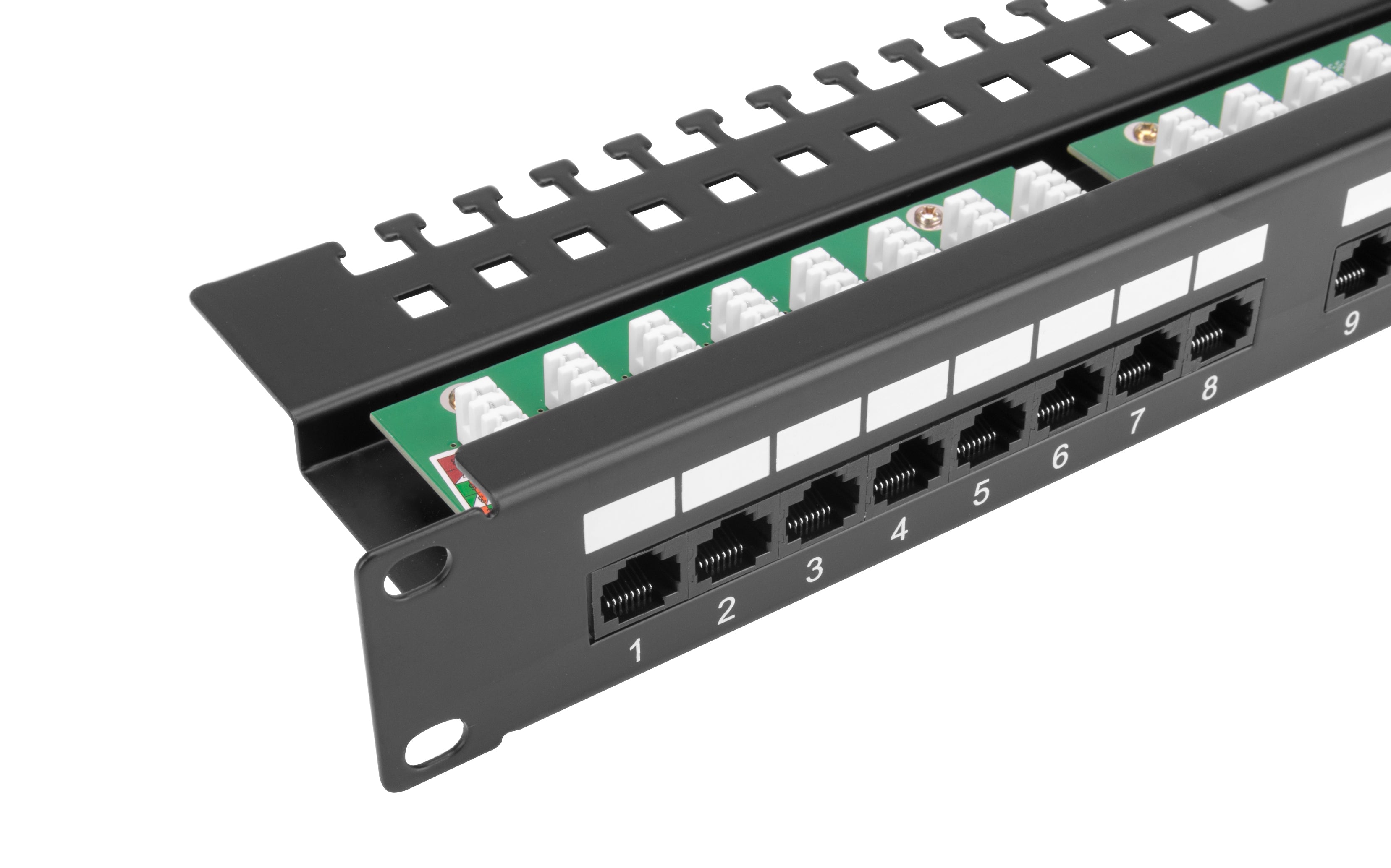 Panel posiada 24 porty KAT.5e UTP oraz ze stałą listwą wspierającą.