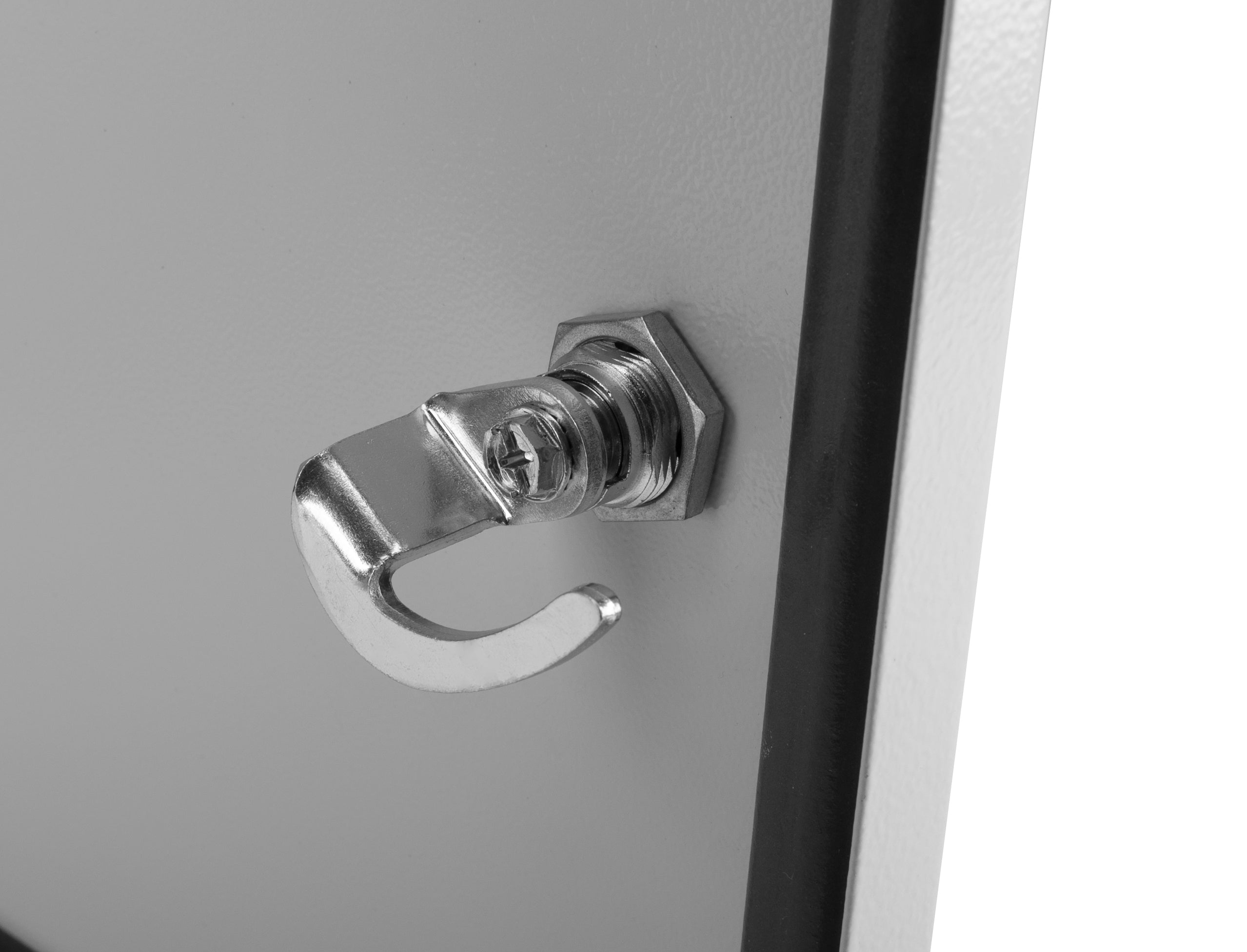 Wytrzymały i funkcjonalny zamek krzywkowy z uchwytem typu L, idealny do zastosowań w szafkach, skrzynkach elektrycznych, obudowach przemysłowych i innych typach zamknięć technicznych. Model wyposażony w rygiel haczykowy oraz dwa klucze EK333 zapewnia wysoki poziom zabezpieczenia i komfort obsługi.