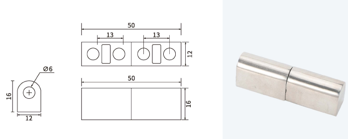 Kompaktowy zawias syfonowy wykonany ze stali nierdzewnej SS304, przeznaczony do zastosowań technicznych oraz przemysłowych. Długość całkowita 50 mm, idealny do mniejszych drzwiczek i obudów. Konstrukcja 2-częściowa pozwala na szybki demontaż drzwiczek bez konieczności odkręcania całego zawiasu. Montaż przykręcany – 4 otwory pod śruby M6, stabilny i trwały.